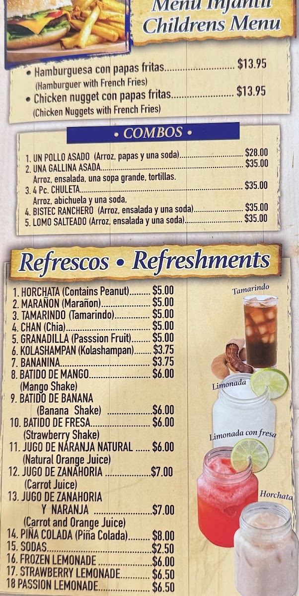 Chicken and beef served with two side choices among white rice, red beans, salad, green plantain, chimol, rice & beans, tortillas, french fries, vegetables, sweet plantain.